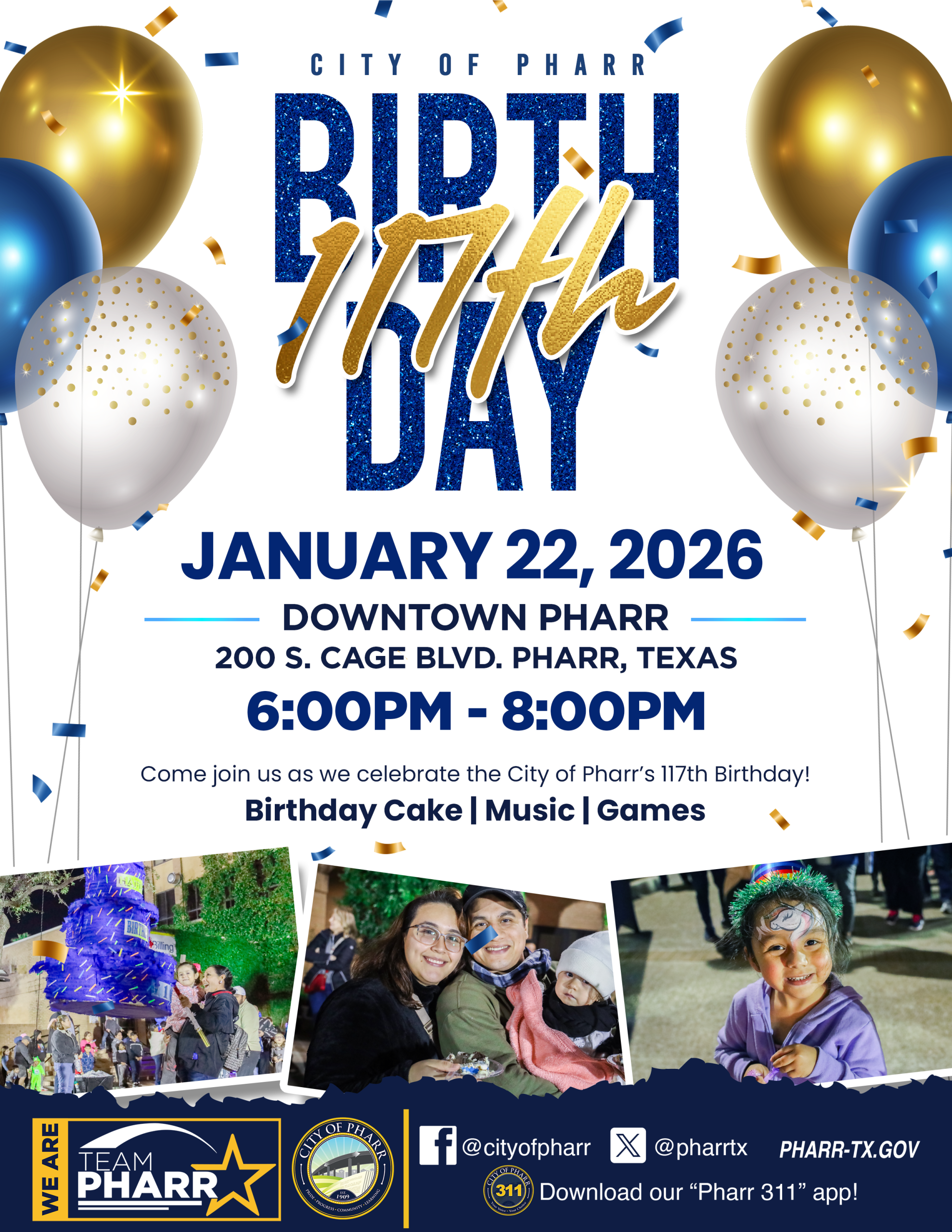 Join us downtown as we celebrate our city’s birthday with cake, music, games, and family-friendly fun. Bring your friends, bring your family, and help us celebrate everything that makes Pharr home. 💙💛