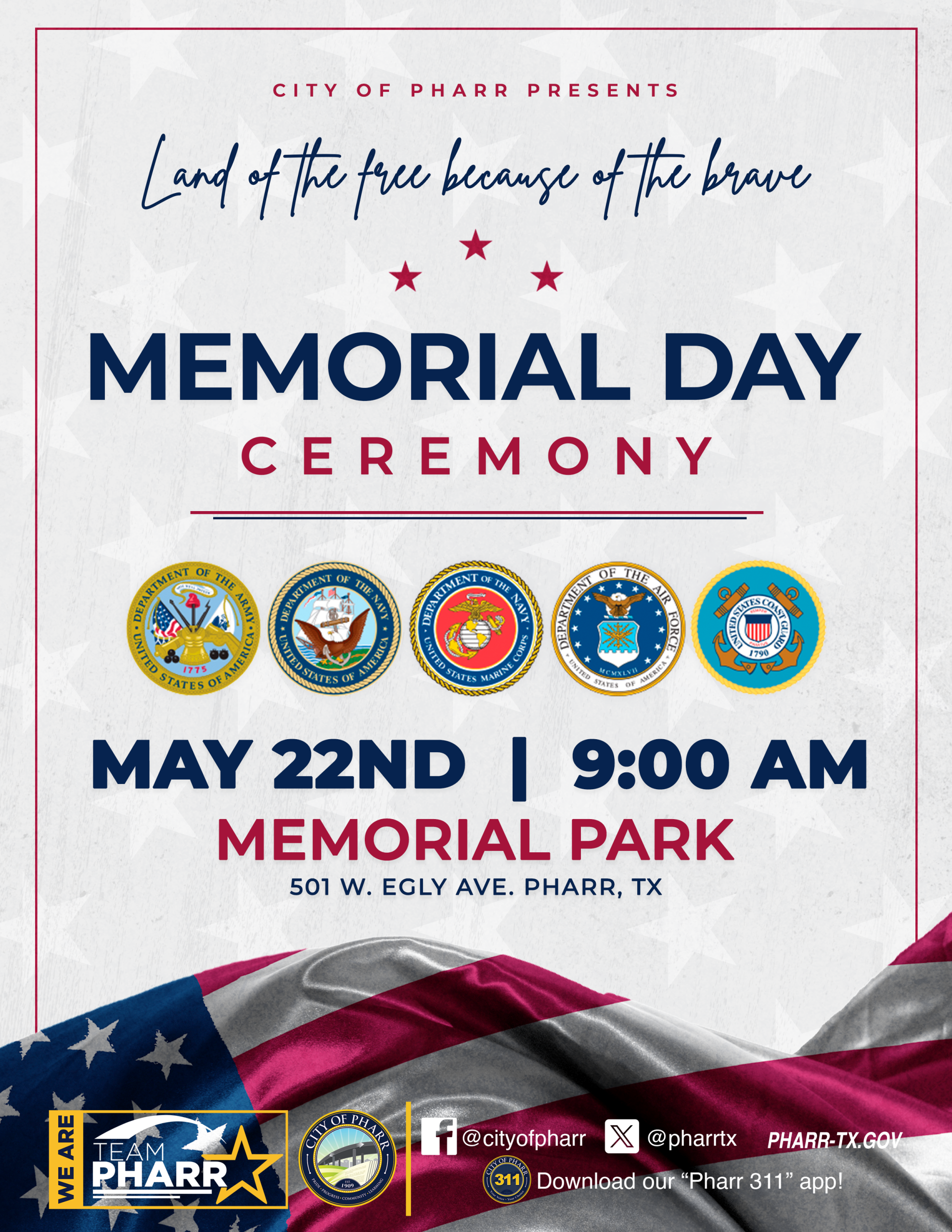 The City of Pharr invites the community to join us for our annual Memorial Day Ceremony as we honor and remember the brave men and women who made the ultimate sacrifice for our country. 🇺🇸